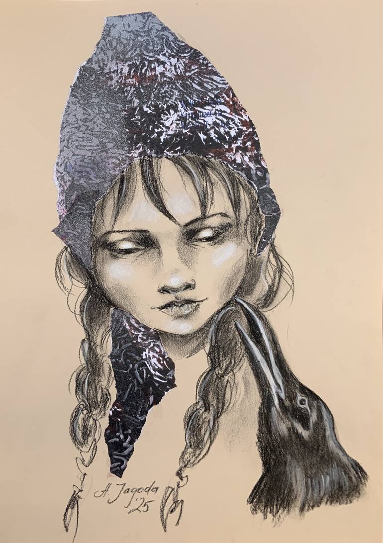 This original mixed-media artwork captures an enigmatic moment between a mysterious young woman and a raven, evoking themes of intuition, the unknown, and silent communication. The delicate yet intense charcoal portrait contrasts with the bold, textured collage elements, creating a striking interpla...