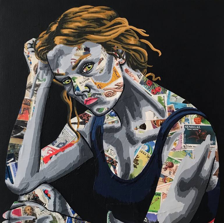 The difficult issue of identity, duality and inner conflict is at the heart of Annabelle's thinking. Whether it is the injunction made to women (on their physique, their activities or their social status) or the personal evolution in our society (where the norm is still the only model and where the difference is stifled), the question is then the same: how do we make our deep convictions coincide with the world around us? How to assert our identity without feeling judged? Can we remain ourselves, flourish, knowing that we are constantly influenced by society, the gaze of others, social networks, money or even success? Annabelle rips, cuts and glues book pages and playing cards on the canvas, which she then covers with acrylic paint. The organic skin of the women that she portrays thus gives way to images and colors that make it possible to transcribe what they feel and who they are.