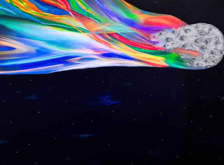 Fantastical representation of what a comet may look like sailing through space. The new artwork is created on top of an existing print that did not survive the artists move out to California. The heat from the fast moving comet creates a rainbow of entrails that chase behind it. Stars are represente...