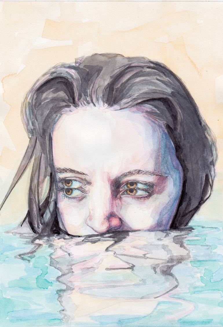 In Crossing a Slight Barrier, the portrait of a woman emerges from the depths of the water, with her face partially submerged up to her nose and two pairs of eyes that defy visual logic. This dualism in her gaze suggests an expanded perception, as if the figure exists in two dimensions of time simul...