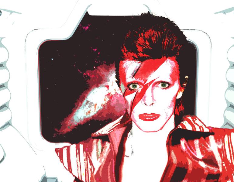 Hommage to David Bowie in the Warhol-like cut silkscreen technique. Inspired by photographs of Duffy and Sukita from the Ziggy Stardust and Aladdin Sane personae. Space suit originally designed by Freddie Burretti. Space ship interior inspired by the designs of Rob Cobb from the film Alien. Backgrou...