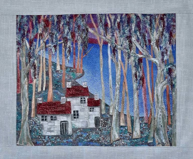 Fantasy decorative landscape in modern mixed media technique- acrylic paints on fabric, textile applique on fabric, quilting and embroidery, elements of encaustic technique. Stitching on top. The picture is coated with matte textile varnish. Sheathed around the perimeter with linen passe-partout wit...