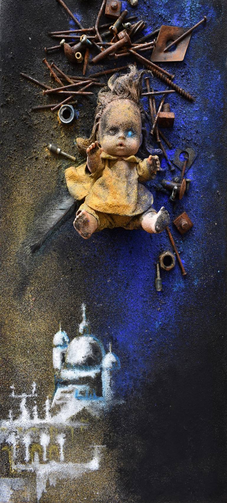 In questa mia opera, ho esplorato la dicotomia tra l'innocenza e la corrosione del tempo. Utilizzando pigmenti e oggetti trovati, ho creato un'immagine sfumata e semi-astratta di una piccola bambola circondata da oggetti rugginosi e frammenti metallici. Questo contrasto visivo incarna la lotta tra l...
