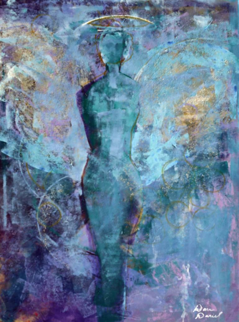 My angel painting, a 40 by 30-inch, gallery-wrapped Acrylic on Canvas, is not just a piece of art but a personal vision from my imagination. It depicts what I feel an angel to be: mystical and vaguely present with a beautiful aura and golden, sparkling wings. To create the sparkles, I used gold and ...