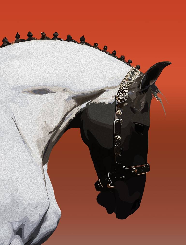 A striking digital artwork featuring a beautifully groomed Andalusian horse with a braided mane and ornate bridle. The contrast between the horse's white coat and deep black markings adds an air of elegance and nobility, set against a warm, rich red backdrop. This artwork captures the grace, strengt...
