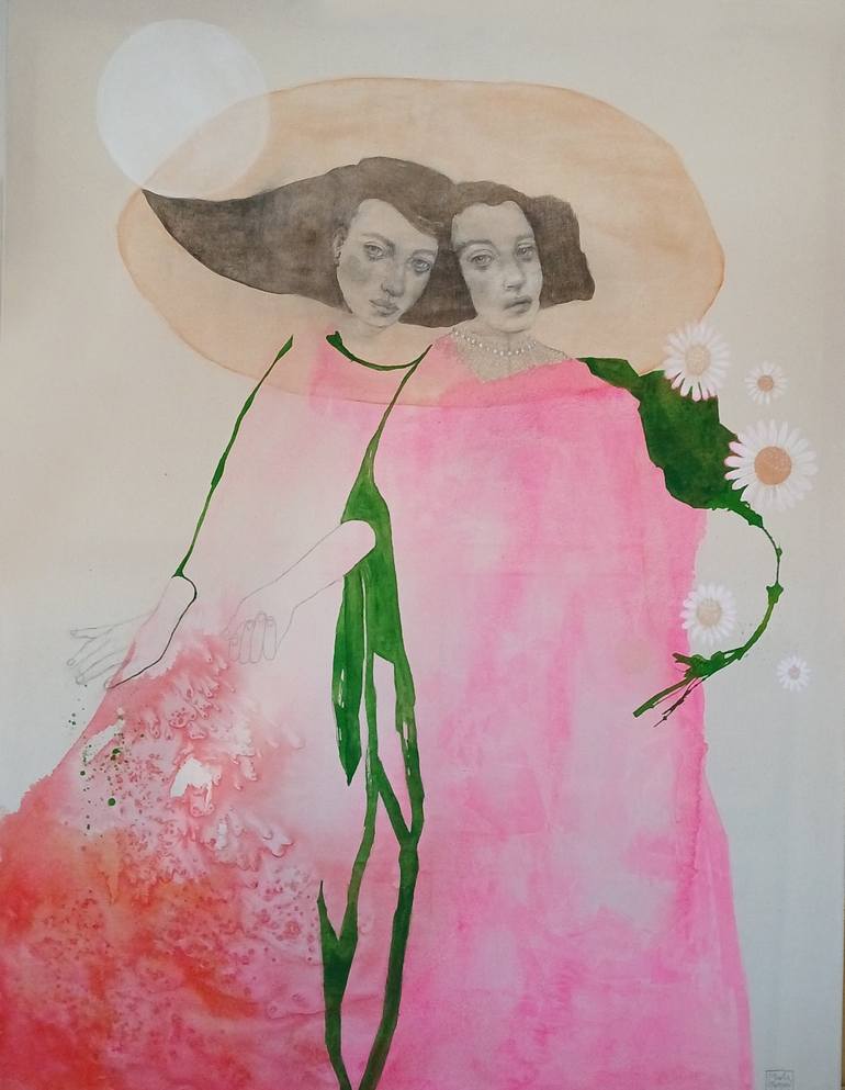 Graphite and acrylic painting on cotton canvas. Continuing with my "enchantement" series, this artwork presents an intriguing scene, mixing drawing and watercolor techniques. Two female figures, delicately drawn in pencil, emerge from the canvas tinted with soft and vibrant shades. Their body are ...