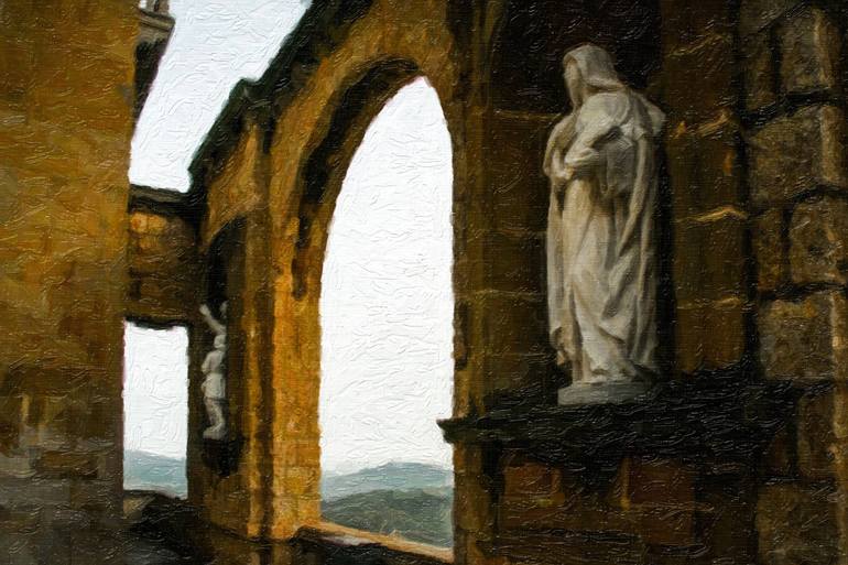 Inspired by a painting style utilized in the works of Rembrandt van Rijn, Diego Velázquez, Vincent van Gogh, Jackson Pollock, and Willem de Kooning, this image is a late afternoon vista from a plaza nook at Montserrat monastery outside Barcelona; where statues stand as testament to a view worthy of ...