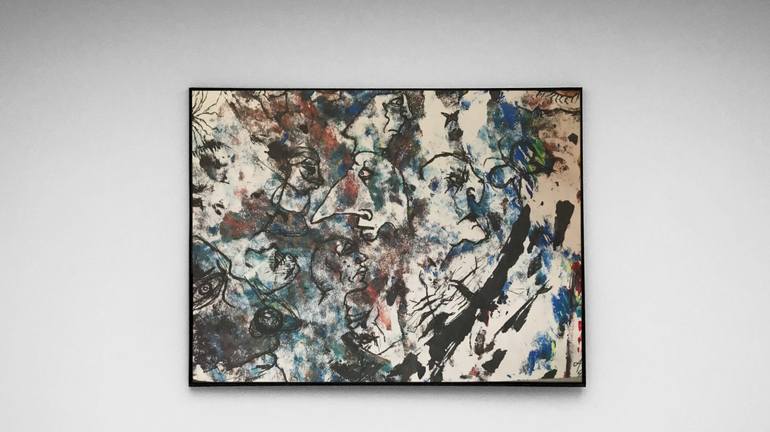 This evocative piece is an exploration of the human experience, blending the raw chaos of emotions with subtle glimpses of identity. Painted on paper with bold, sweeping gestures and intricate details, it tells a story of complexity and vulnerability. The textured interplay of blues, reds, and black...