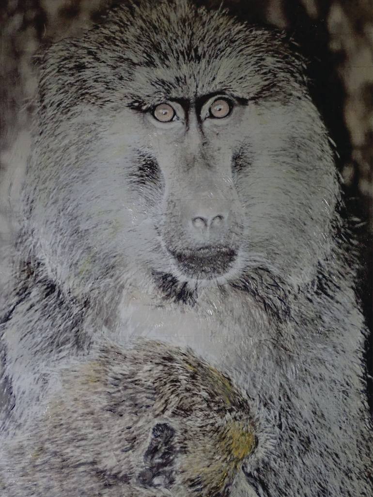 This is one of a series of complex photographs using a technique called 'bas relief photography.' A photo image is printed on Yupo paper (which doesn't absorb any liquid) and then depth is added to the image using impasto, oleopasto and oil paints. The original photograph was taken on a photo safari...
