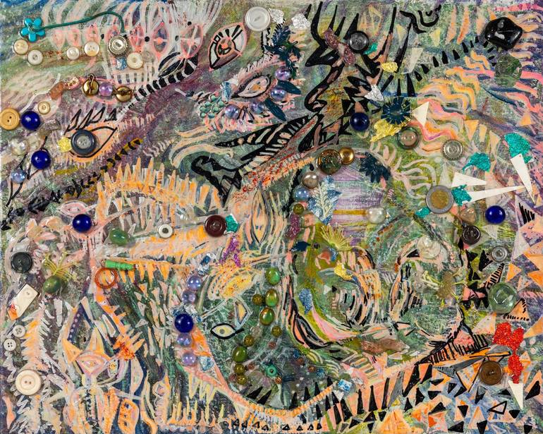 BIO -DANIEL AARON SCHWARTZ   I have been painting and working in mixed media for more than 50 years, since I started gluing together flotsam and jetsam I found on the beach when I was four years old. This unconscious and layered approach has always been a vital element of everything I create. I often will paint a dream I had or be inspired to focus on an emotion or a single word. Everyday objects like buttons, twigs, jar tops and hairpins are used as textural elements in my work as are found street signs, personal items like watches, baby shoes and doodles.
