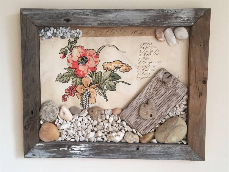When I find a reminder of past history and nature, I combine this in a work of art like this one. The delicate beauty of a French original floral painting from 1920s is contrasted by a rustic wooden frame, driftwood, pepples, and stones found on sunny beaches.