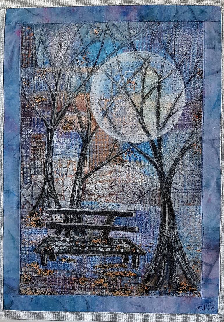 The fabric painting is made in decorative mixed media: acrylic painting on fabric, appliqué of small patches, my monoprints on fabric plus decorative free machine stitching over all layers using embroidery threads and metallized threads. The landscape is semi-abstract. Symbolism. The painting is s...