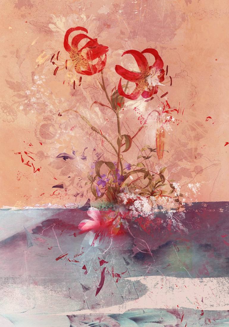 "Mixed media artworks inspired by nature, blending the playful vibe of PopArt with the elegance of FineArt." "Teis Albers is known for his works with a strong graphic composition, shadows, some mystery and a nostalgic mood. A continuous exploration of composition, shape & texture. Seeking to convey something that words cannot grasp." Teis Albers is known for his works with a strong graphic composition, shadows, some mystery and a nostalgic mood. A continuous exploration of composition, shape, emotion and texture. “ His main inspiration comes from music album covers and movie posters. It's the strong combination of photography and graphic design that makes a work appealing and you make decisions based on the artwork. Am I going to listen to this record, read this book or watch that movie. He's intrigued with that effect and tries to use it as an inspiration to get better at his craft.” "Teis Albers is an artist from Berlicum, the Netherlands. He brings elements from nature and pop art together with his own signature style. The viewer continues to discover new things in his intricate arrangements, with hidden details in each composition." From the subconscious he plays with these different elements and lets the compositions arise layer by layer. Everything comes together in a collage where he has full control over size, composition and color. This is followed by the physical processing, which is built up with various materials. The basis is digital but the finishing touch is handicraft. The works are a mix of illustration, typography, photography and various compilation techniques. He finds inspiration in vintage brochures, street art, flowers, travel, film and art. He studied at the graphic school in Eindhoven and started working as a freelancer after graduating. After several years of working and living in the city of 's-Hertogenbosch, he moved to a more remote village. This contrast between city and village forms the basis for his contemporary art, cracked walls with layers of torn posters right next to nature and a wide view. Due to his broad interest in art, he does not want to commit to a particular style. He prefers to push the limits of his abilities and likes to experiment with new techniques. For the Bouquet series, he photographs each flower separately to later digitally combine them into a bouquet in which various graphic layers are added. The Mixed-Media artworks are expressive collages in which anything can happen.