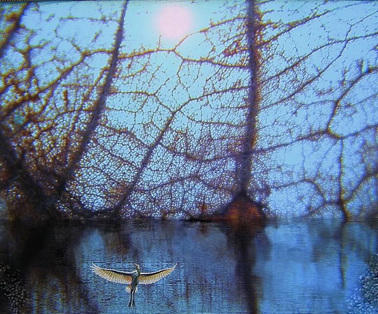 New Media: Oil, Digital, New Media, Photo and Manipulated on Canvas Digital work made with original micro photograph from leaves, printed on canvas , oil picture of a bird and silver leafing pen details added to complete the composition. Professionally hand stretched canvas over 1,2'' deep wood b...
