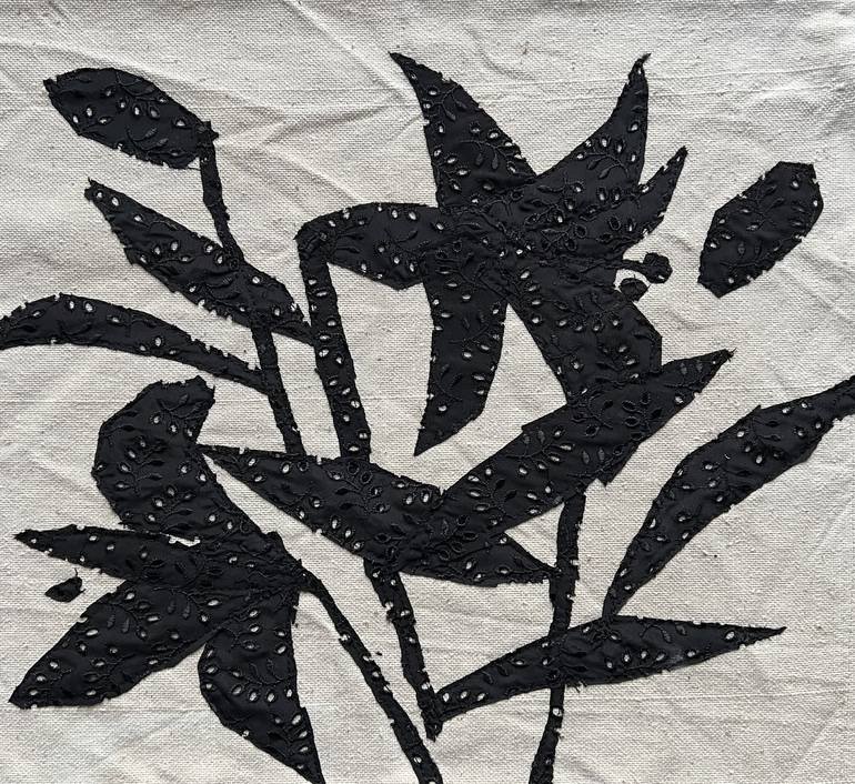 40x40cm Fabric on canvas This piece is part of a series of textile artworks exploring the quiet beauty of flowers. Crafted from thick, natural canvas and adorned with black perforated fabric, the work features raw, unfinished edges that add an organic, rustic charm. The delicate floral silhouette s...