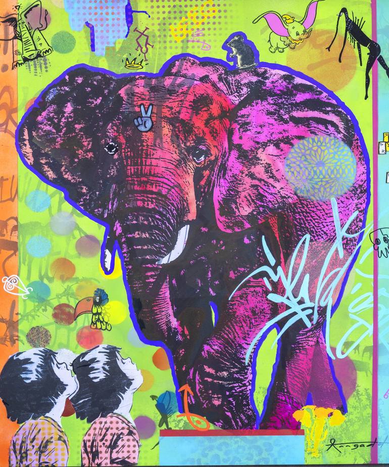 In crafting this artwork, I've explored a vibrant fusion of bushman rock art with street art on my original photograph of an African elephant in the Addo National Park, South Africa. Using graffiti, pen, spray, and ink, I worked on the black-and-white original image. This painting captures the majes...