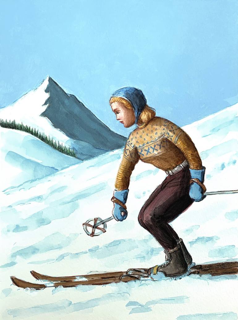 I love painting skiers, fashionable women, beautiful women on the move. Of course I hope viewers will gain a sense of freedom and strength when viewing strong, confident women like this one. I appreciate retro or vintage images and love to paint them.