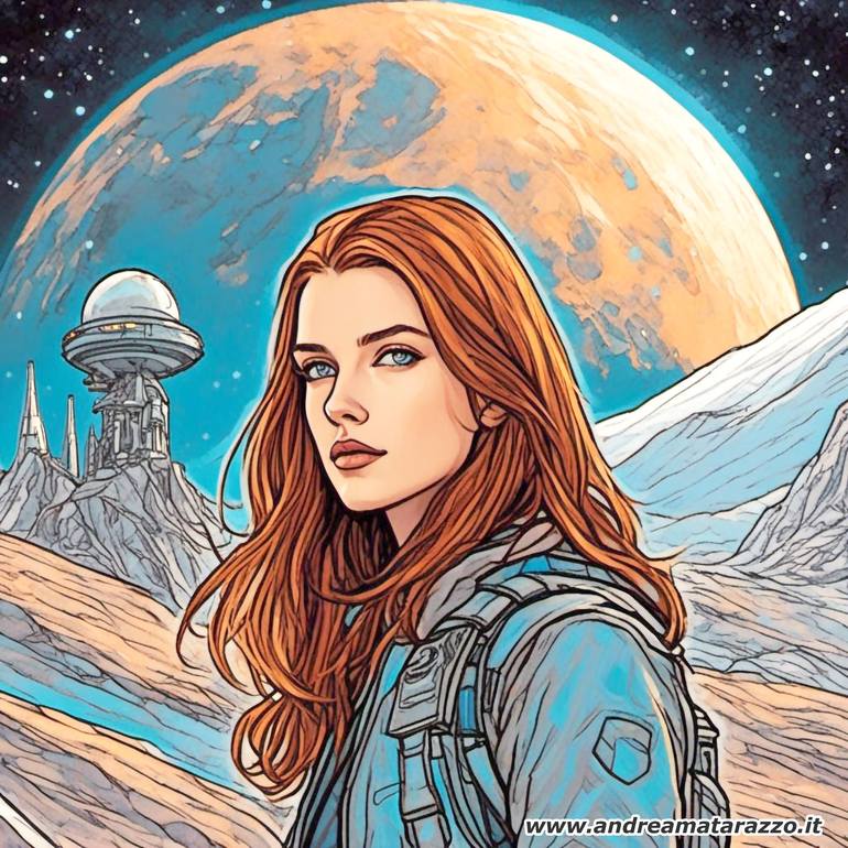 Charming girl exploring space. The fascinating dream of space exploration of planets in a style between modern design and traditional .