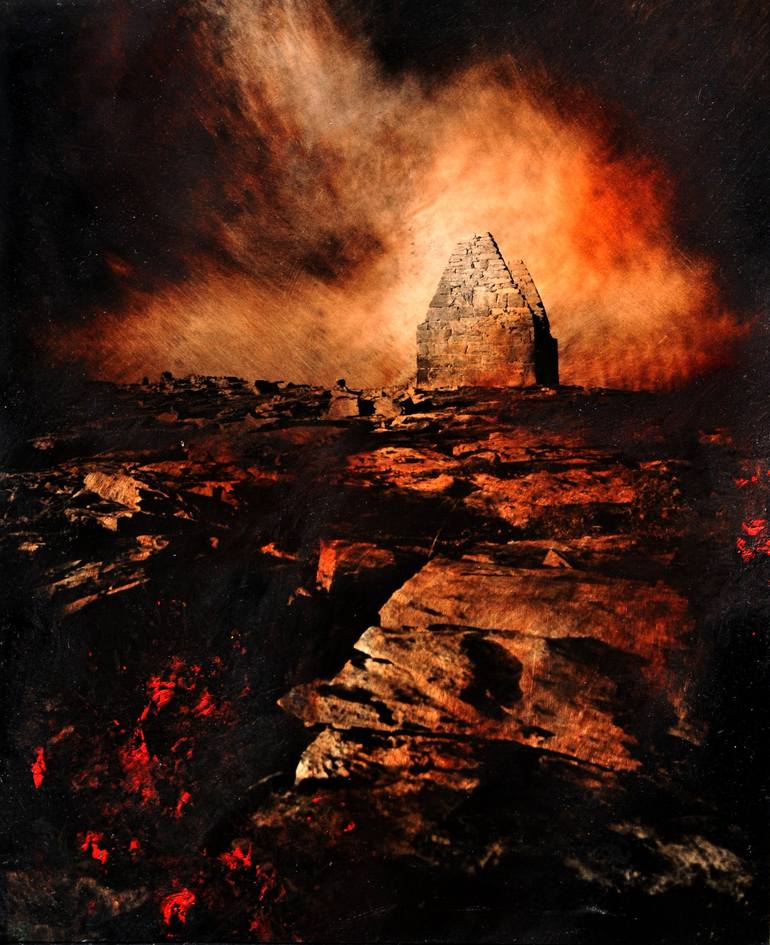 At the summit of a great stone field in Ireland. A lonely ruin of an ancient church standing starkly against the sky. I photographed this on traditional black and white film and developed the print in my darkroom. The work was mounted to a custom wood panel and then my oilgraph technique was appli...
