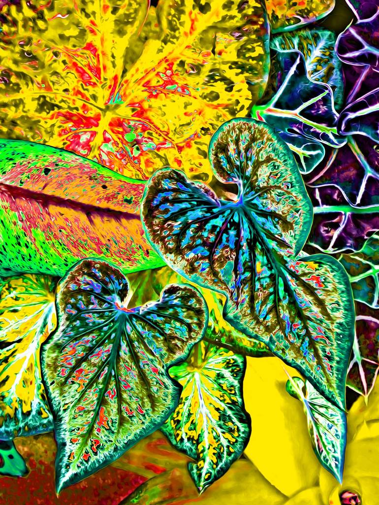 This is a digitally edited/manipulated photograph/print of colorful garden leaves.