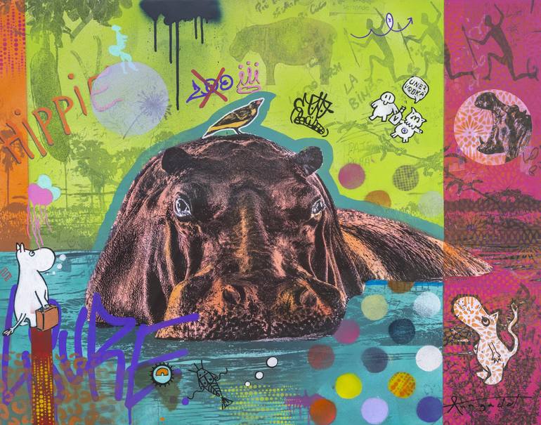 This hippo I photographed in the beautiful Okavango Delta in Botswana, Africa. In creating this mix of my wildlife photography and combining it with pen, spray paint, and inks, I pursued blending traditional African symbolism with graffiti—ancient and contemporary forms of expression. This is envis...