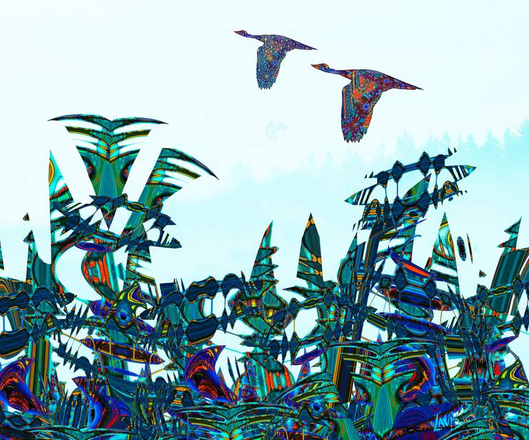 This image is from a body of work called 'The Digital Toolbox" Painting in the Age of Technology' It reflects the feeling I had as a young child immigrating to Canada in the 1950's. It seemed every home I went into had a flight of plaster geese lined up the wall and every friend had a father who hun...