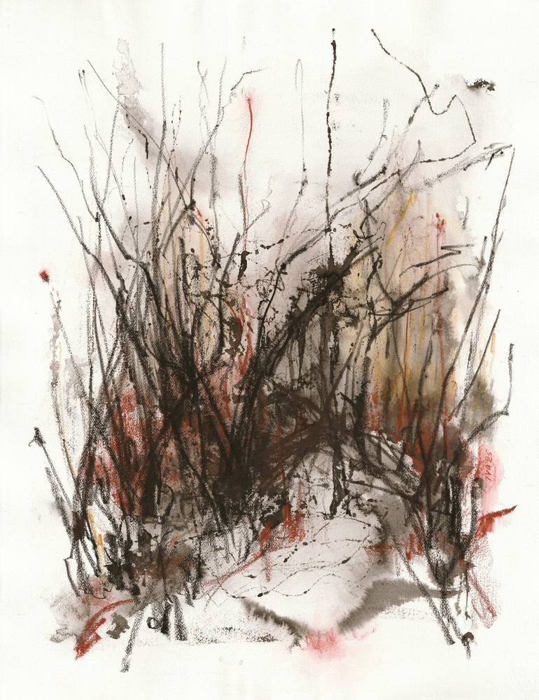 This work on paper, created in ink and watercolor, evokes a mysterious and profound inner landscape. A hidden path, covered in snow, disappears into the undergrowth. The nervous lines and the dark, warm colors create an atmosphere that is both captivating and melancholic. This semi-abstract landscap...