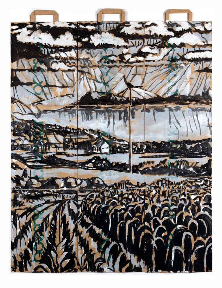 High Voltage – from the series Fragments of a Harvest – 9 bags. A power pole rises like a giant receiver above fields and houses. Lines cut the sky like lightning, ears of grain form into armies. Nature and technology meet in a charged balance of supply and threat. Fragments of a Harvest is a large-...