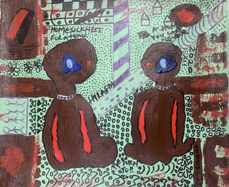Hiraeth is a poignant artwork that beautifully encapsulates a sense of longing for an unreachable home—a place of comfort and belonging that either no longer exists or perhaps never truly did. The piece features two figures, painted in warm shades of brown and red, sitting together in a state of sha...