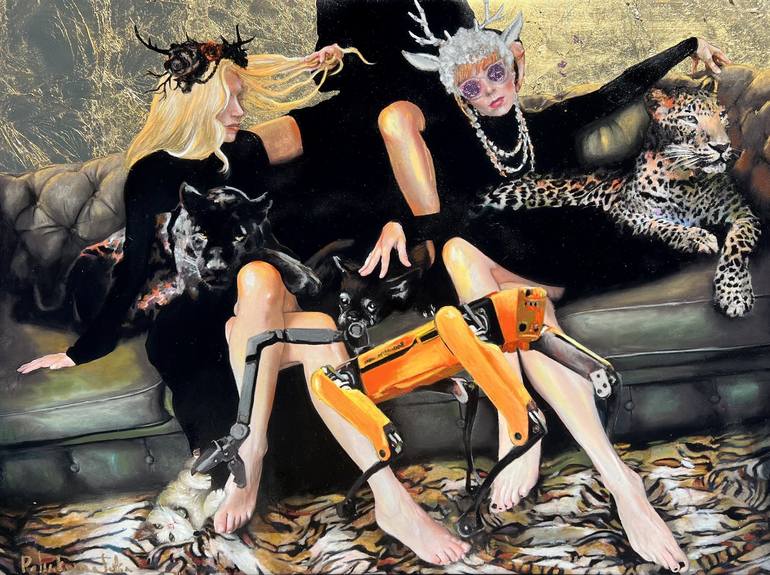 "Home Sweet Home" is a mixed media artwork that invites you into a surreal fantasy. Imagine a world where wild animals and robots coexist as beloved pets, creating a harmonious blend of nature and technology. This piece combines digital techniques with the richness of oil and pastel, enhanced by pho...