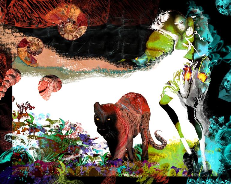 "The Huntress" - The Dream Time Stories |. Fantasy Illustration This storytelling exotic painting referring to a spiritual and symbolic concept will add a special atmosphere to your studio and home decor. The piece is one of my favourite artworks, inspired and influenced by music and various sour...