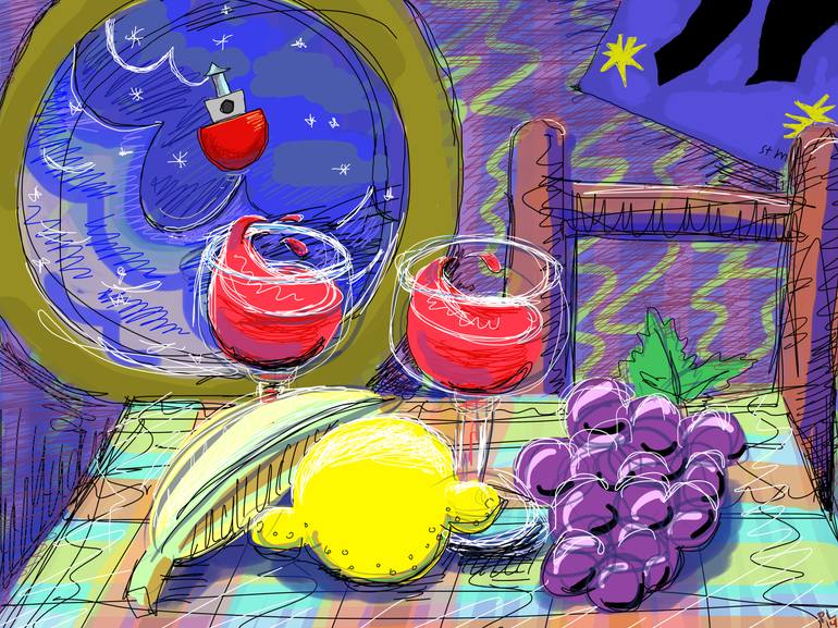 The work was inspired by the still life genre, but it is a reinterpretation of it. It is a representation of a still life arranged on a table, in a cabin, on a ship, at sea, in a storm. Stillness is a lot to ask for. A large print of Matisse's Ikarus swings as it hangs on the wall as feathers drift ...