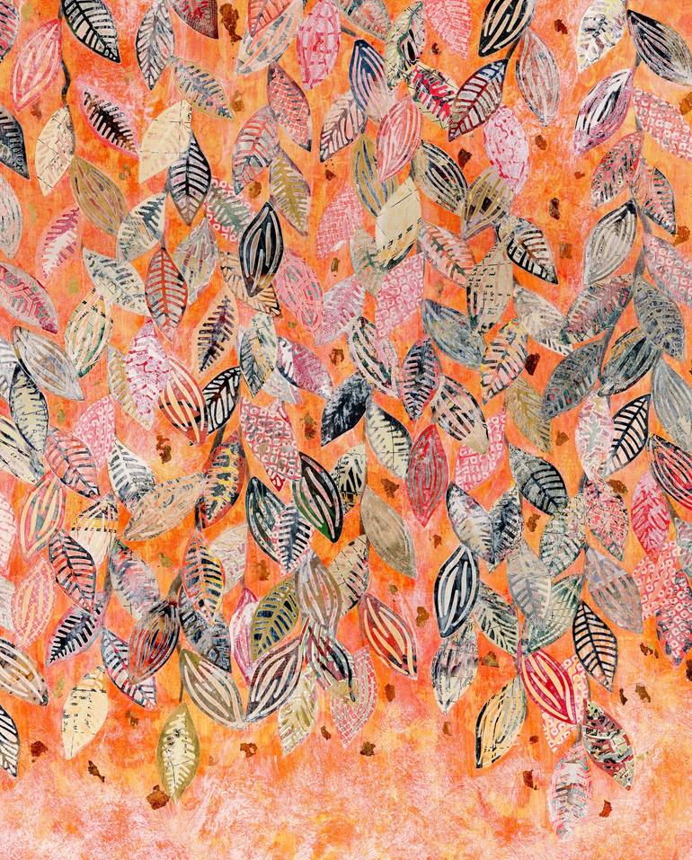 In this earthy, textured collage on orange-painted cardboard, die-cut leaves in a palette of rich red and brown tones cascade downward in a gentle, organic rhythm. The natural forms evoke the quiet poetry of autumn and the passage of time. The whole artwork has been coated in a thin film of white ac...