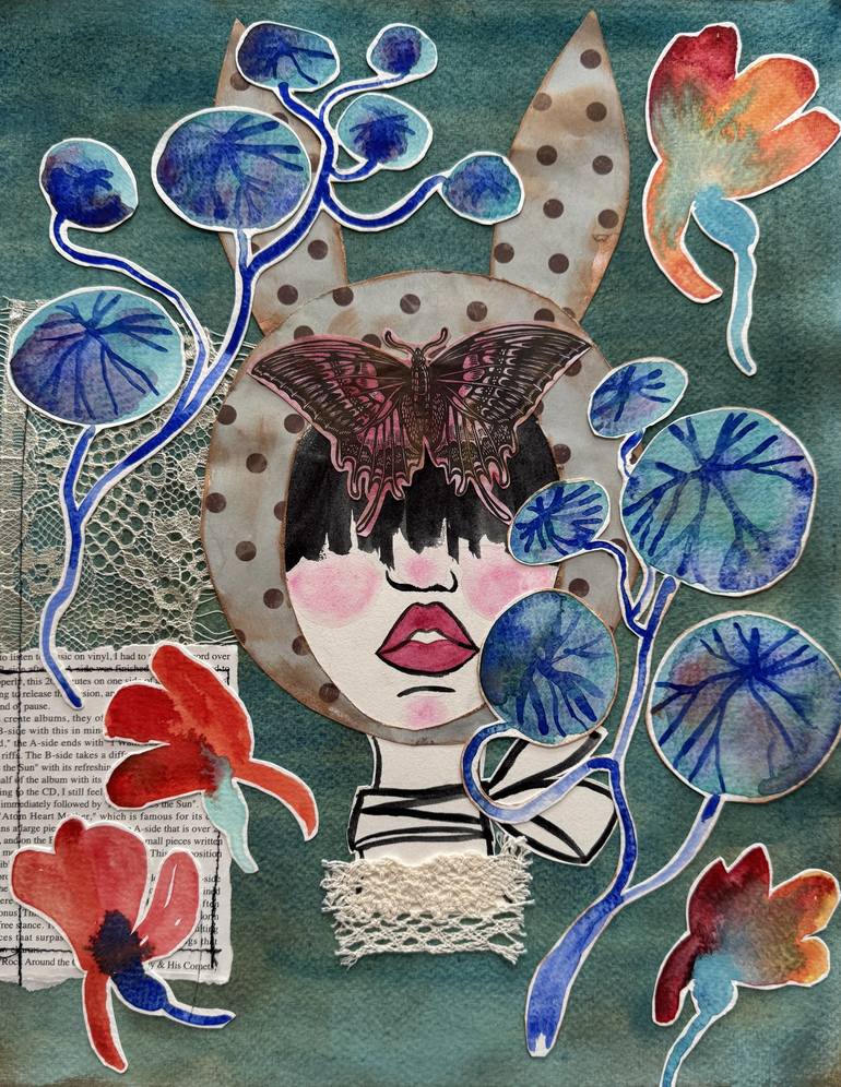 ""In the Secret Garden"" – Mixed Media Collage Artwork with Bunny Ears and Butterfly Mixed media on 300gsm paper One of a kind artwork Size: 35 × 27 × 0.1 cm This is an original mixed media artwork created on heavyweight 300gsm paper. The piece combines watercolor floral elements, hand-cut paper p...