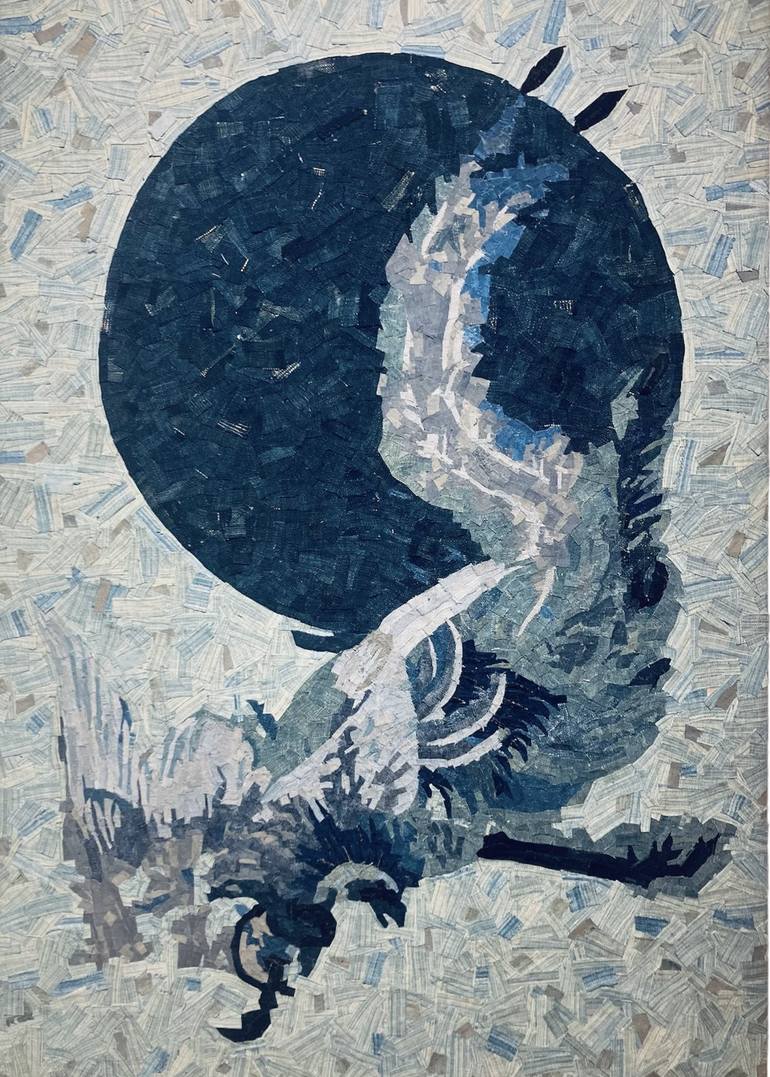 This artwork is part of the "Indigo Legacies: Sustainable Artworks" series, drawing inspiration from Itō Jakuchū’s iconic Hi Izuru Hōō-zu (“Sunrise Phoenix”) and reinterpreting it through the language of sustainable textile art. Using vintage indigo-dyed boro fabrics, the majestic image of a phoenix...