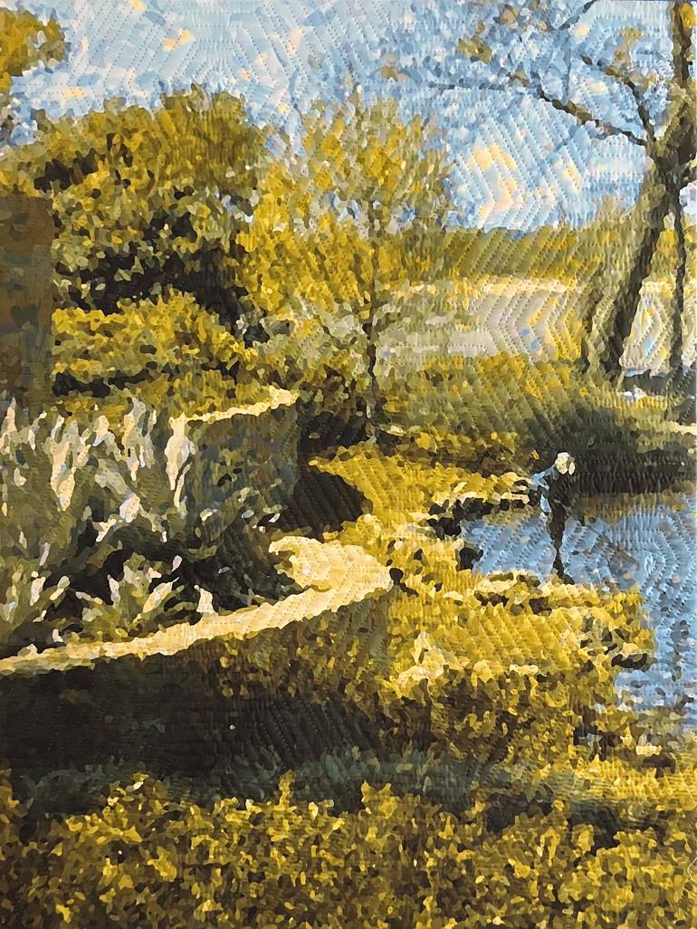 Digitally manipulated photography, printed on organic cotton sateen, hand quilted, gallery wrapped on canvas stretchers, framed, ready to hang