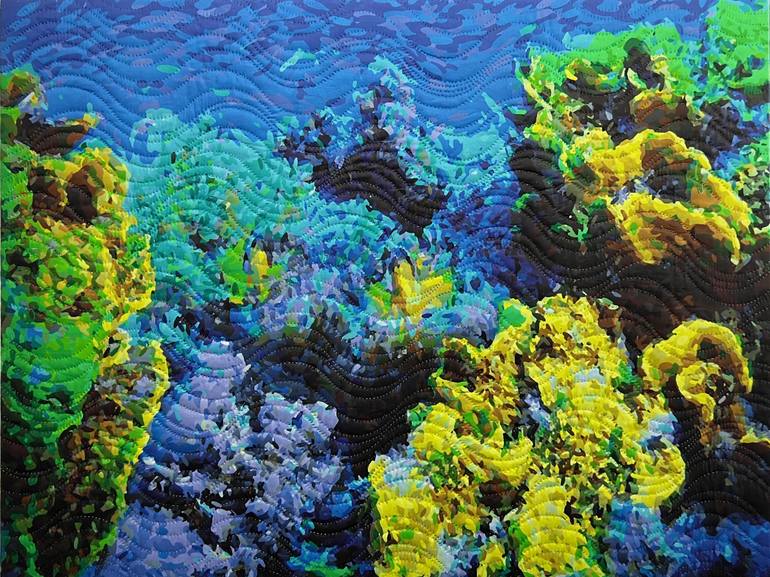 Digitally manipulated photography, printed on organic cotton sateen, hand quilted, gallery wrapped on canvas stretchers, framed, ready to hang