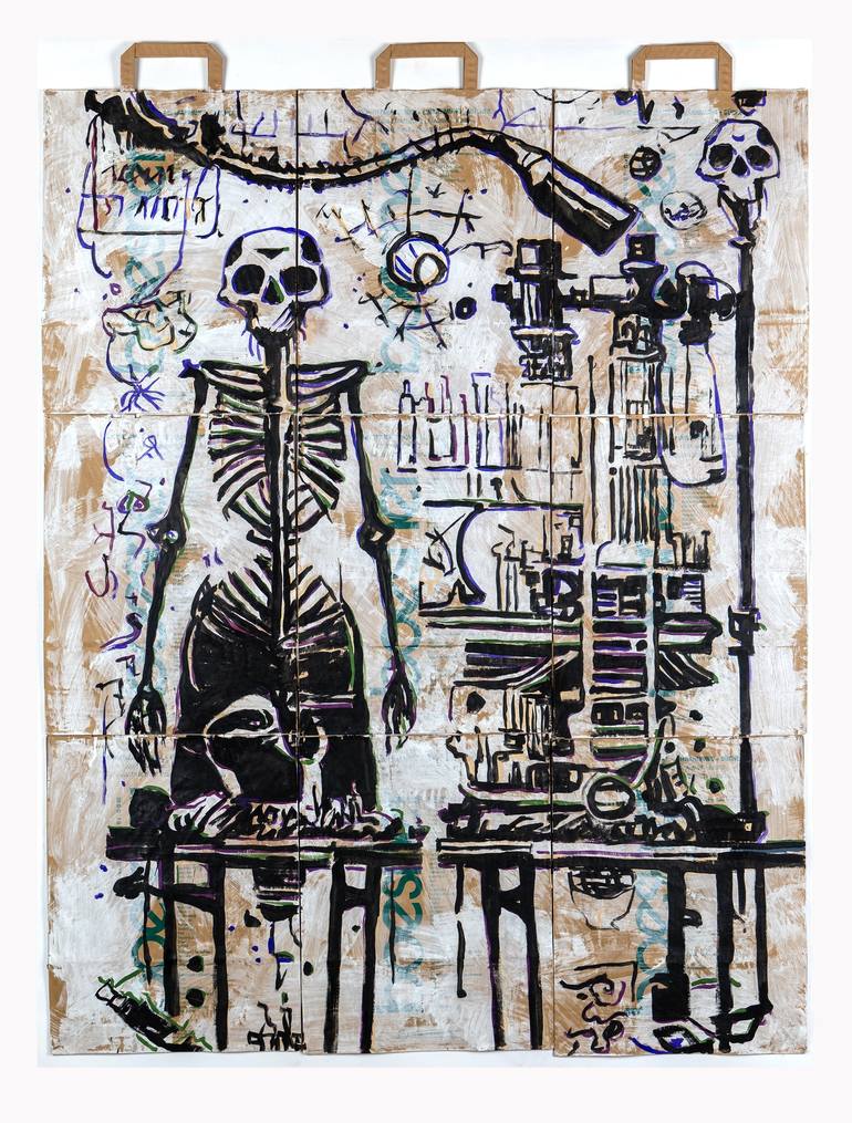 Inorganic – from the series Fragments of a Harvest – 9 bags. A skeleton appears beside laboratory devices and chemical apparatus. Life shifts from the organic to the synthetic – between research, manipulation and decay. Fragments of a Harvest is a large-scale installation of 96 painted shopping bags...