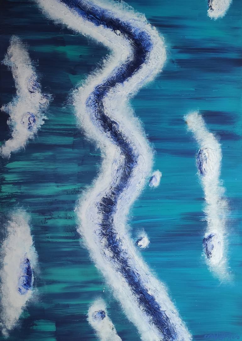 This original textured acrylic painting embodies the stillness of an island juxtaposed with the vibrant energy of flowing forms. As you gaze upon the calm waters blending breathtaking hues of turquoise, blue, and ultramarine, you’ll find yourself immersed in a stunning landscape that captures the ma...