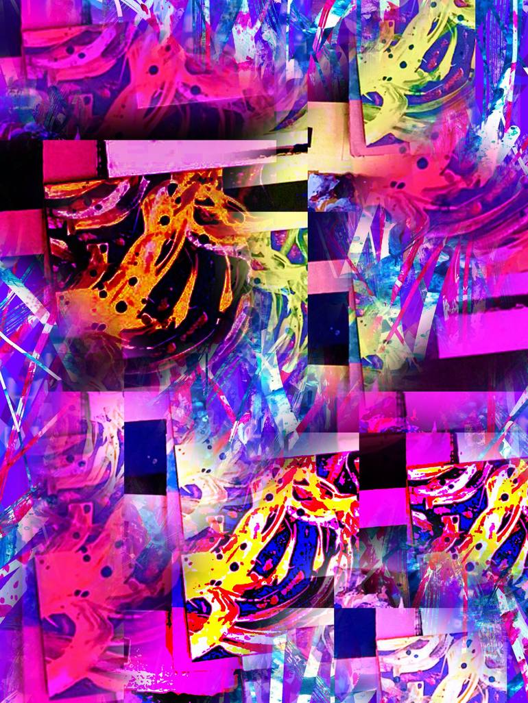 Kaleidoscopic Dreams 20 is inspired by the kaleidoscope. My image is a combination of acrylic on cardboard and abstract digital designs that focus on the magenta hues with splatter of yellow and black color shapes to create movement in the painting like a kaleidoscope turning.