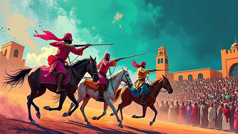 The painting shows a group of knights on their horses, galloping with speed and enthusiasm in a vast arena in front of a large crowd gathered to watch them. The knights are wearing traditional clothes with bright colors, reflecting the authentic Moroccan heritage, while they are surrounded by archit...