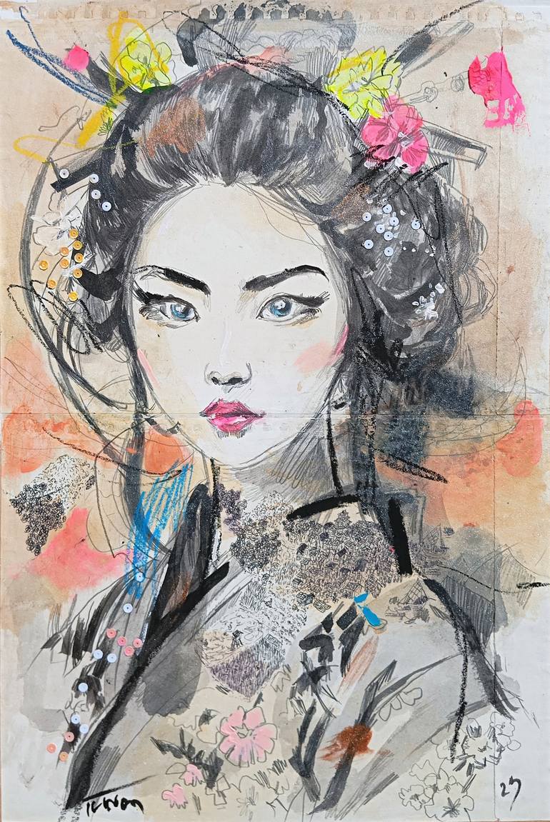 - original drawing on paper collated on board - gouache, pencil, ink, collage (paillettes) - the artwork is sprayed with museum quality fixative - COA certificate of authenticity - the colors may look different on other devices/ screens The small ink drawing part (under the neck) is done by my son...