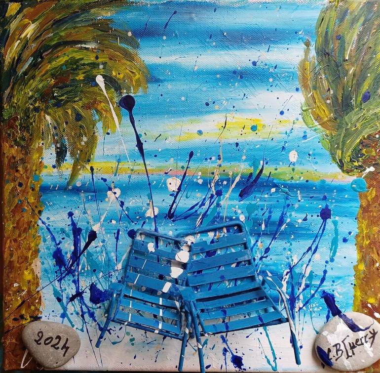 In this vibrant work, I set out to capture the energetic dynamics of an impetuous breeze by the sea. Using acrylic, collage and salvaged objects, I constructed a scene in which the blue chairs symbolise moments of rest swept by the bright waves of life. Expressionism intertwines with figurative art,...