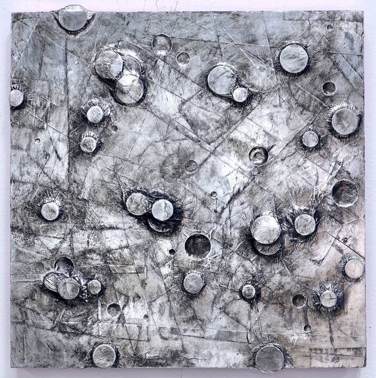 This piece was began in 2013. The piece is a plywood panel with divots and rubber disks as the background on which metal tape crisscrosses and pressed down leaves a impressionable surface both negative and positive, over which I wiped black oil paint. This year I added foil leaf to the edge and ba...