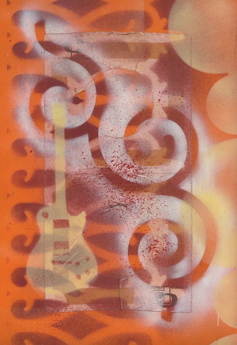 I've been making art with stencils that I cut from a calendar of vintage electric guitars. Then I found a box of old 45 records and loved the sleeves that the records came in and thought that the two would look great together. I also have some pieces curly plastic that I found on the street I though...