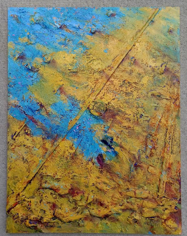 "Lines in the Sand 2" is a captivating mixed media artwork, exploring water's presence in urban settings. The artist skillfully blends acrylic and oil paints with found objects on an MDF panel, creating a textured surface with intriguing depth. Notches in the back ensure secure and easy wall hanging...