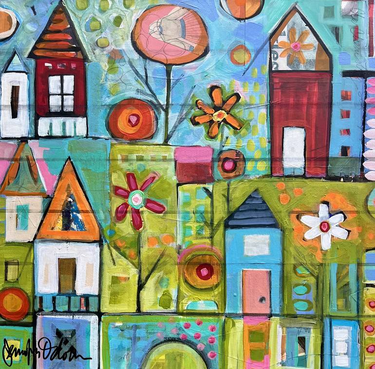 Jenny Odom, a.k.a. iggyart, has been a working artist for over 20 years. Her colorful art is collected throughout the U.S., and beyond. Her work is primarily one dimensional, using heavy textures and layers to create interest. Subject matter ebbs and flows from whimsical creatures, characters and cityscapes, to dramatic landscapes that are almost a colorfield of light and layers. As well, Jenny has dug into the world of paintings that make a statement, that express an idea, a life change, a loss, a new beginning. Words sometimes end up in her paintings. Intention is important, but letting go of the control is where the real magic begins. Jenny creates original artwork, as well as prints available. She also has created a line of clothing and housewares using her colorful images. Jenny now resides in North Georgia Mountains and is working on her hillside studio.
