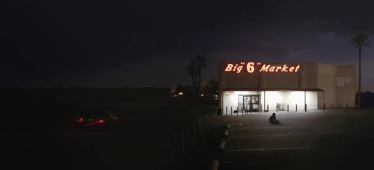 Made from photographs and digital paint. This piece offers its owner a sense of life in LA. The ominous feeling of this city at night is portrayed by the combination of the single isolated shop, homeless man and dark sky. The car zooming past reinforces the plight of the man in the parking lot.