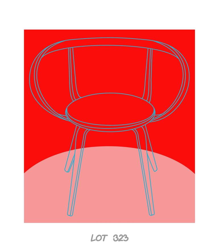 Illustrated here is the 1990 Bowden painting on canvas of the iconic George Nelson PRETZEL CHAIR ca. 1952. BOWDEN has created thirteen colorations of this iconic design, this variation is Lot 323 Pretzel Chair -RED. As listed in a 1990 Don Treadway Auction Catalog as Lot 323. Bowden's original pain...