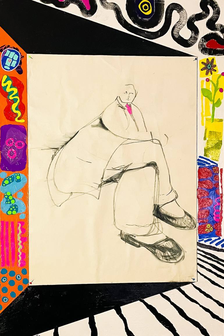 This piece contains a sketch that I found hidden away in my closet. The painting features a central figure, a man elegantly sketched seated, adorned with a striking pink tie that draws immediate attention. The simplicity of the pencil sketch contrasts beautifully with the bold, colorful border tha...